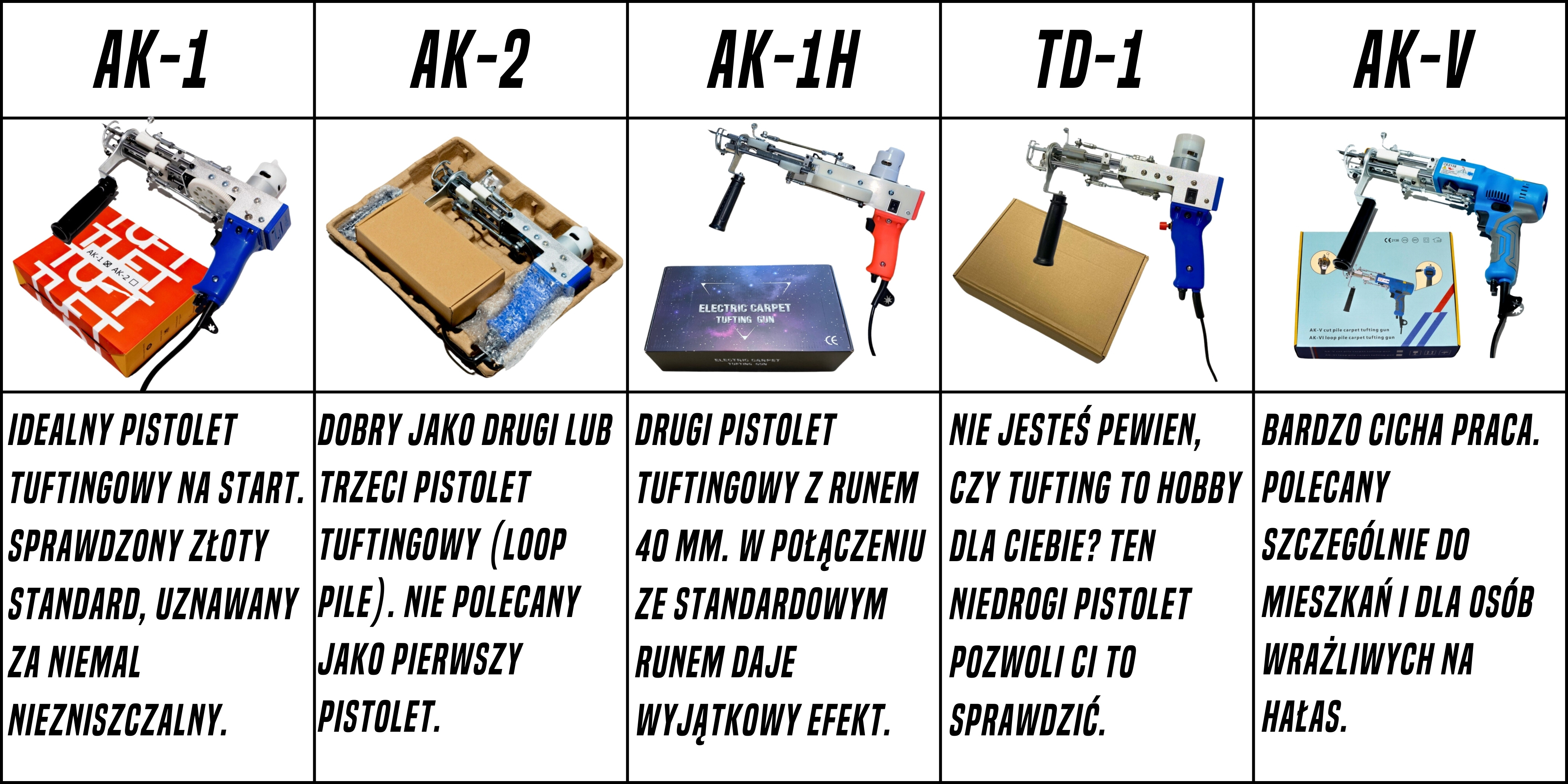 Na początek rzućmy okiem na kluczowe różnice między pistoletami do tuftingu w tabeli na obrazie powyżej. Dzięki temu szybko zobaczysz zalety i możliwości każdego modelu.